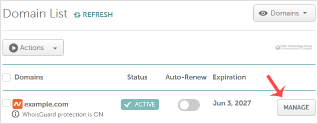 3. Under the domain list, You can see a list of your domains. In front of your domain, click on the Manage button.